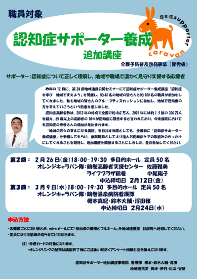 昨年12月に地域連携公開セミナーで養成講座を開催し、40名の地域の方々と100名の職員がサポーターになりました。職員全員がオレンジリングを持てるように職員対象の養成講座を2月26日と3月9日に開催しますので、ぜひ参加してください。